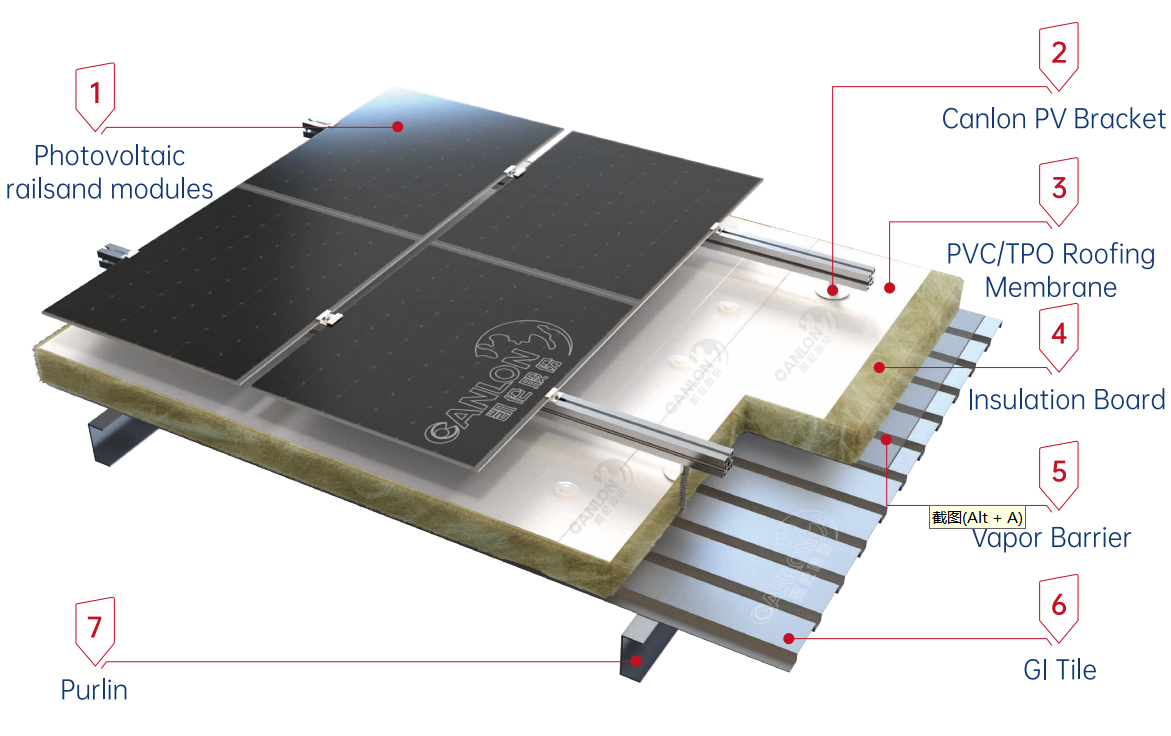 Otro sistema fotovoltaico de techo de una sola capa utiliza fijaciones especiales para fijar la capa aislante de la membrana impermeable sobre la base de placa de acero corrugado, y los bordes superpuestos de la membrana se sueldan con aire caliente para formar una capa impermeable completa. La instalación fotovoltaica utiliza soportes verticales, rieles y otros métodos para fijar módulos fotovoltaicos, que pueden aumentar adecuadamente el ángulo de inclinación del módulo y aumentar la generación de energía, proporcionando la mejor solución para instalaciones fotovoltaicas de techo flexible nuevas y existentes. La membrana impermeable blanca aumenta la reflectividad de la luz solar hasta en un 80%, aumentando los ingresos por generación de energía en más de un 10%.
