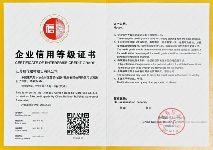 Recientemente, Canlon , basándose en su solidez integral y desempeño comercial confiable, recibió la calificación crediticia más alta (AAA) de la Asociación China de Impermeabilización de Edificios después de una rigurosa revisión. El certificado de crédito AAA es válido desde 2026 hasta 2029. Esto no solo reconoce en gran medida la reputación corporativa y el valor de marca de Canlon , sino que también significa el papel ejemplar de la empresa en la promoción de la construcción del sistema crediticio de la industria. Canlon ha recibido esta calificación crediticia más alta durante muchos años consecutivos.