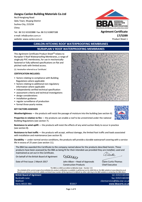 Basándose en un conjunto completo de líneas de producción italianas importadas y plataformas innovadoras como el Instituto de Investigación de Tecnología Avanzada de Suzhou y el centro de pruebas y certificación CNAS, Canlon ha mejorado enormemente el rendimiento de la membrana de PVC en términos de resistencia al envejecimiento, impermeabilización y resistencia al viento. Los detalles flexibles son más confiables y el tiempo de envejecimiento acelerado por el clima artificial de los paneles integrados PMP alcanza las 12 000 horas. . El índice de resistencia al levantamiento del viento alcanza 6000 pa dinámicamente y 9200 pa estáticamente , lo que proporciona a los sistemas fotovoltaicos una vida útil de al menos 25 años, una construcción única y protección de ciclo de vida completo.