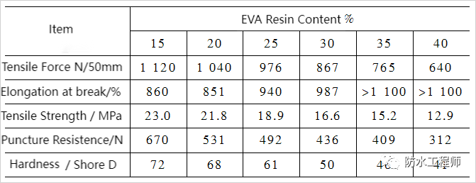 Utiliza HDPE como resina principal y se modifica añadiendo resina EVA. Se investigó el efecto del contenido de resina EVA sobre las propiedades mecánicas y la resistencia a la perforación de la lámina (espesor 1,0 mm). Los resultados se muestran en la Tabla 1.