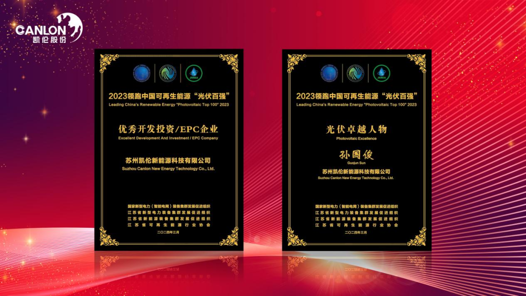 El 8 de marzo, Suzhou Canlon New Energy Technology Co., Ltd. ganó las 100 compañías fotovoltaicas de 2023 China Top 100 y el premio 'Excelente premio de inversión de desarrollo/EPC Enterprise ' por liderar la energía renovable de China, y el Sr. Sun Guojun, gerente general de Canlon Zero Carbon Technology Co., Ltd., ganó el premio 'Excelencia fotovoltaica '.