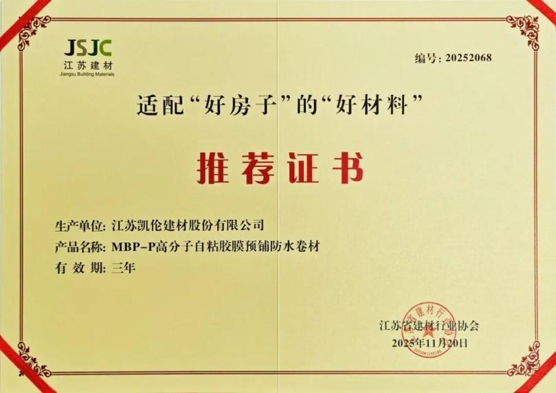 El 20 de noviembre, después de una rigurosa revisión por parte de la Asociación Provincial de la Industria de Materiales de Construcción de Jiangsu, la membrana impermeable autoadhesiva de polímero MBP-P de Canlon fue seleccionada en la lista de 'buenos materiales' recomendados y adecuados para 'buenas casas' debido a su excelente rendimiento del producto y calidad de protección ambiental.