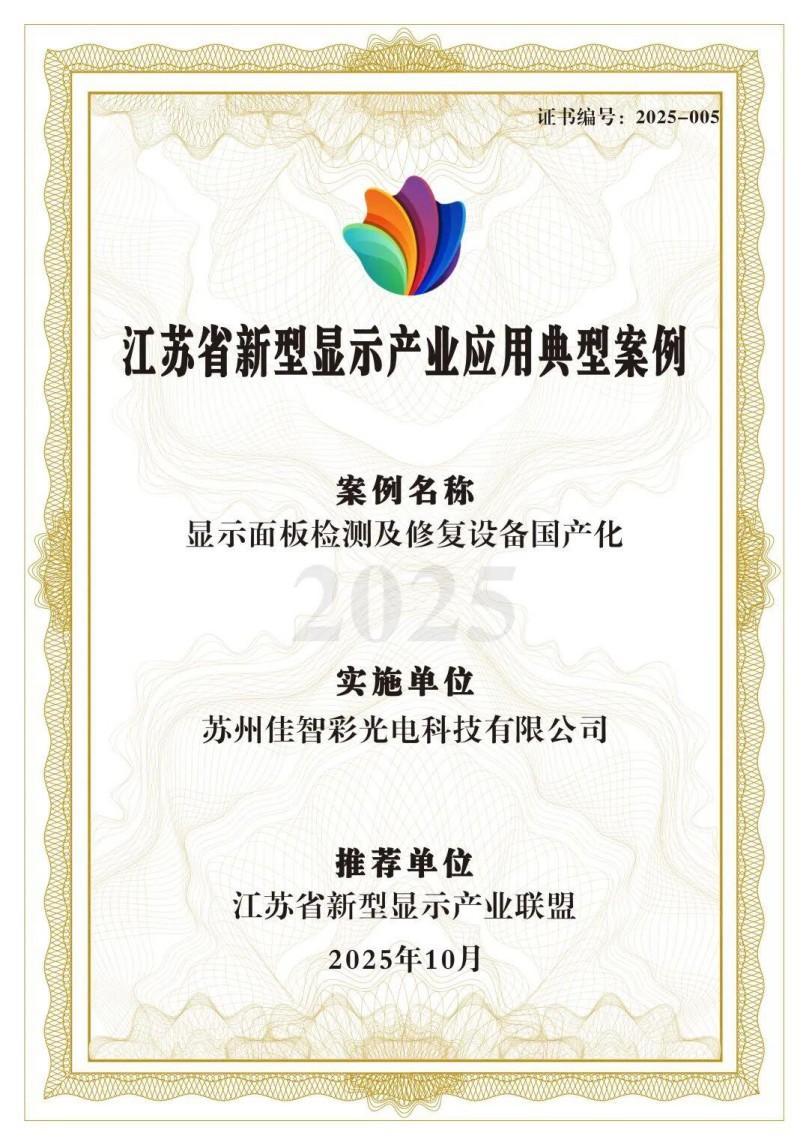 En octubre, la Alianza Provincial de la Industria de Nuevas Pantallas de la Provincia de Jiangsu seleccionó y elogió casos típicos de nuevas aplicaciones de pantallas en la provincia de Jiangsu para 2025. Suzhou Jiazhicai Optoelectronics Technology Co., Ltd. se destacó con su proyecto 'Domesticación de equipos de reparación y prueba de paneles de pantalla' y fue reconocido como un caso típico en el campo de la producción industrial.